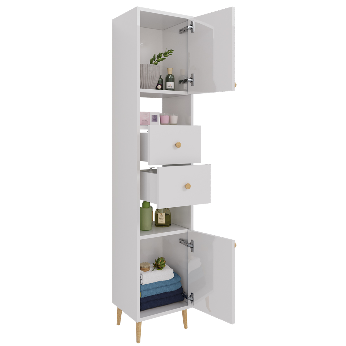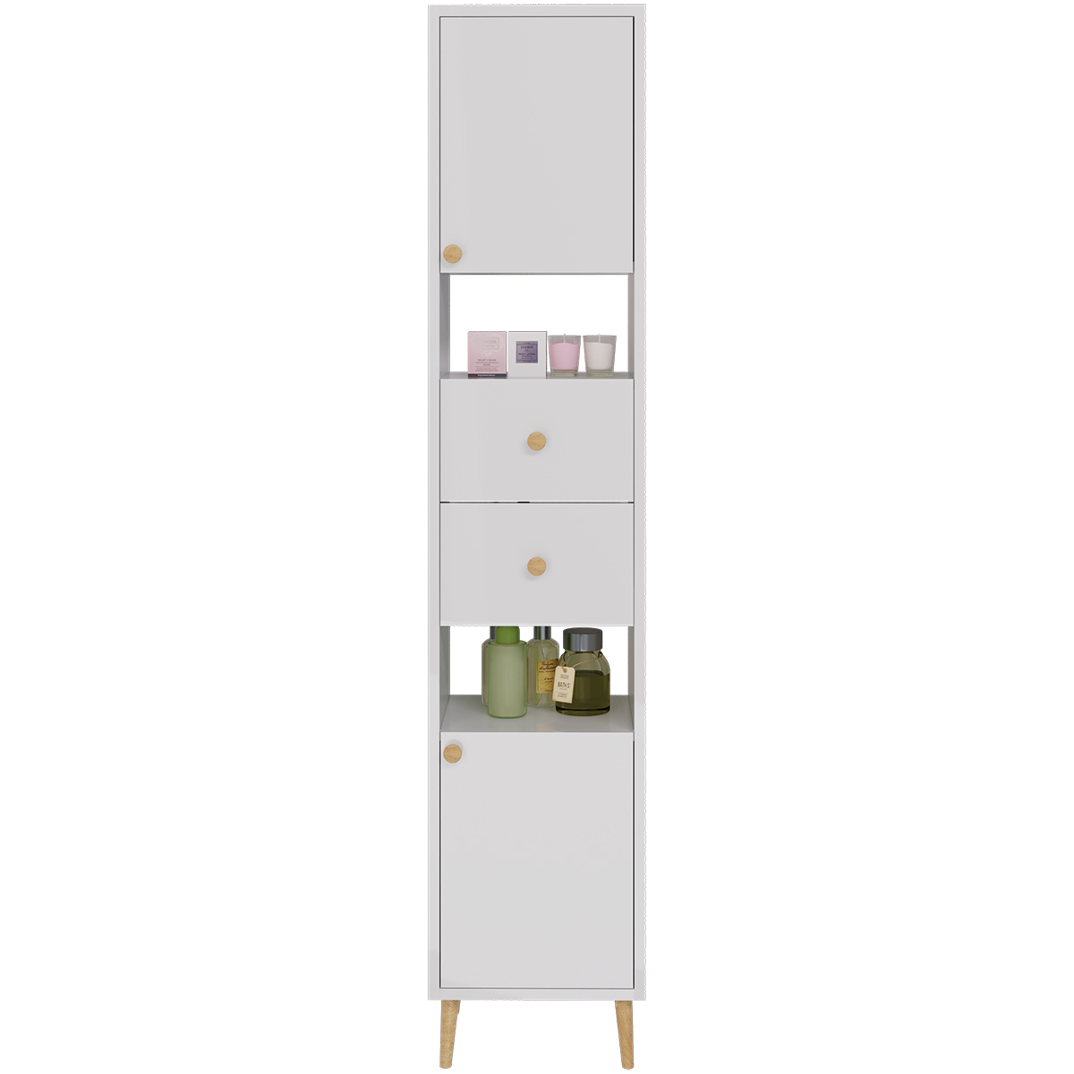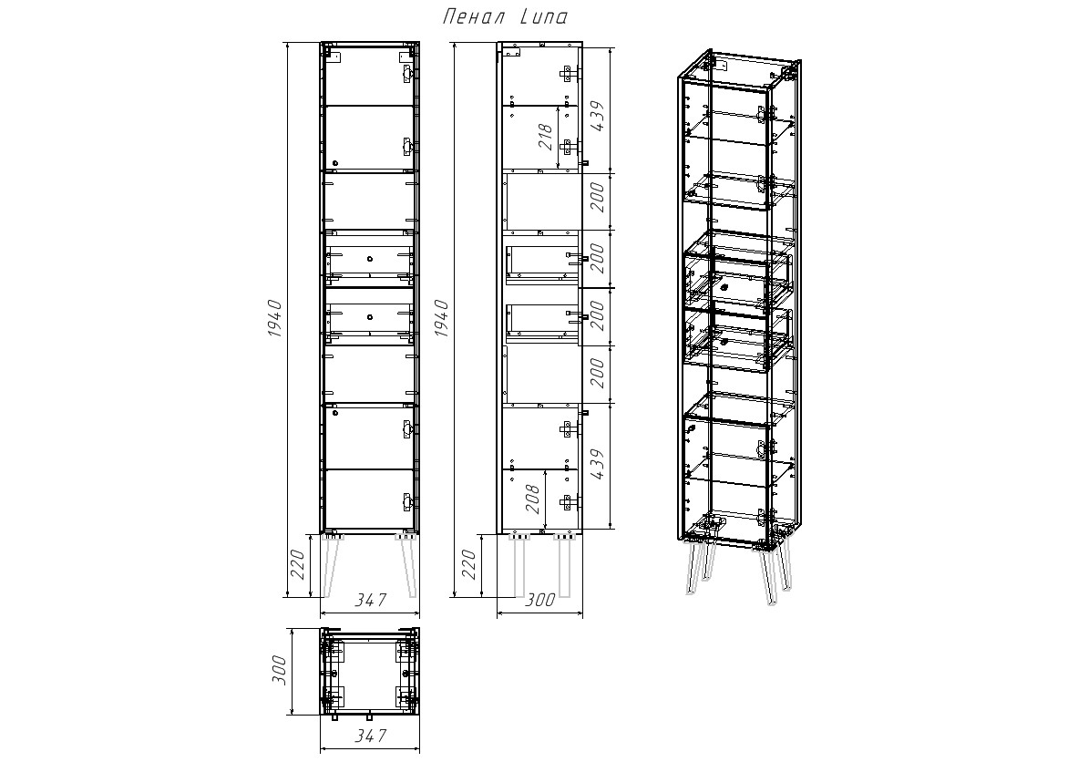 | Оснащение | Две дверцы, две открытые полки, два ящика. |
