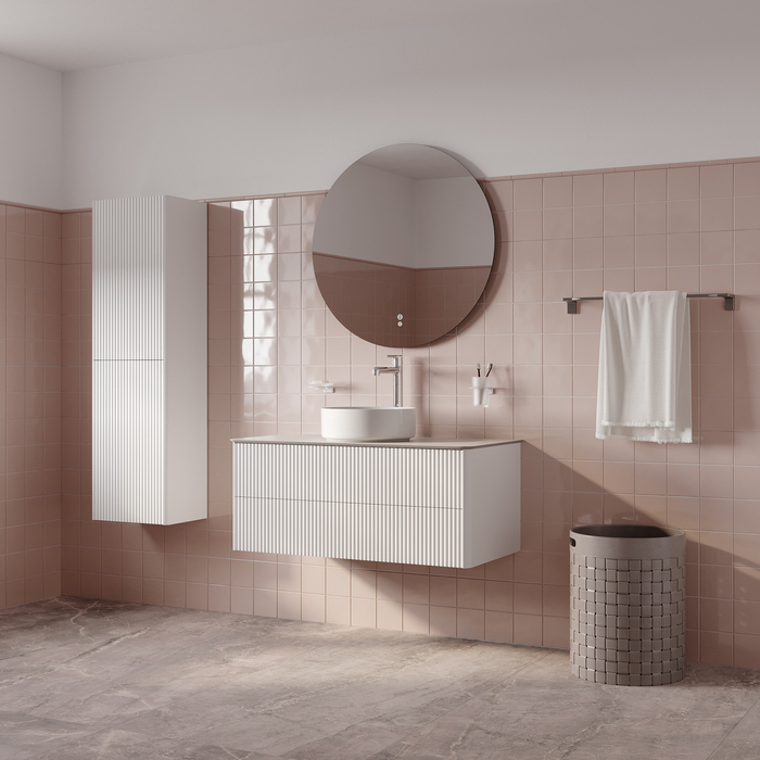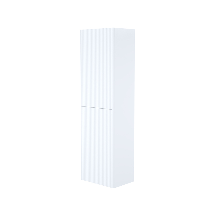 - Подвесной пенал для ванной в классическом белом цвете с трендовой вертикальной фрезеровкой дополняет коллекцию мебели Aiger.