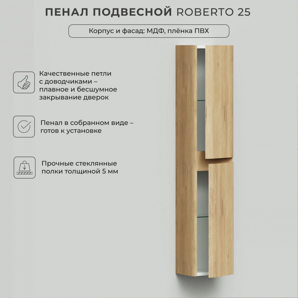 Шкаф пенал для ванной из коллекции Roberto – универсальное решение для современной ванной. Невероятно органичная по дизайну коллекция Roberto великолепно смотрится в древесных фактурах. Эстетика изящества и минимализма - скругленные фасады, отсутствие лицевой фурнитуры. Функциональный и практичный пенал в ванную комнату выполнен из влагозащищенного МДФ, покрыт древесной пленкой-ПВХ. За распашными дверцами органайзера регулируемые полки, на которых вы сможете разместить бытовую химию и средства личной гигиены. Петли с доводчиками обеспечат плавное и бесшумное закрывание дверей. Подвесной способ установки дает возможность не только визуально увеличить пространство, но и обеспечивает быстрый и удобный доступ для уборки. В ассортименте нашего магазина так же представлены пеналы в ванную напольные и универсальные шкафы пеналы в ванную. Мебель способна вместить в себя достаточно много вещей. Изысканность, простота и гармоничность - все сошлось в этой прекрасной коллекции!