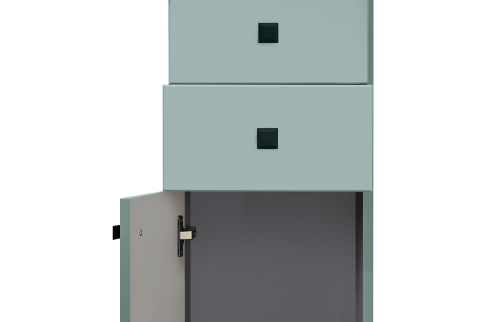 Шкаф-колонна напольный, справа - отделение для халатов с распашной дверью, слева -две дверцы и два выдвижных ящика.
