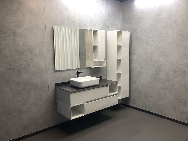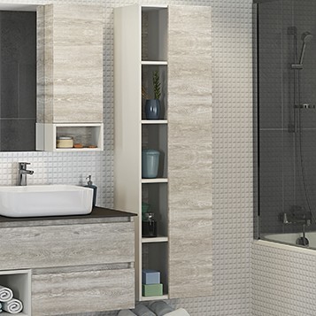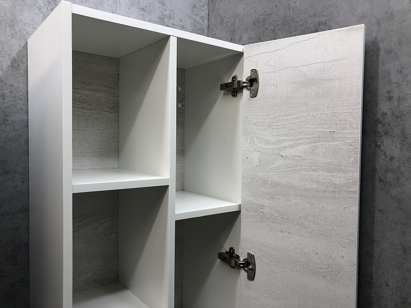 - Подвесная шкаф-колонна с одной распашной дверью и пространством для открытого хранения.