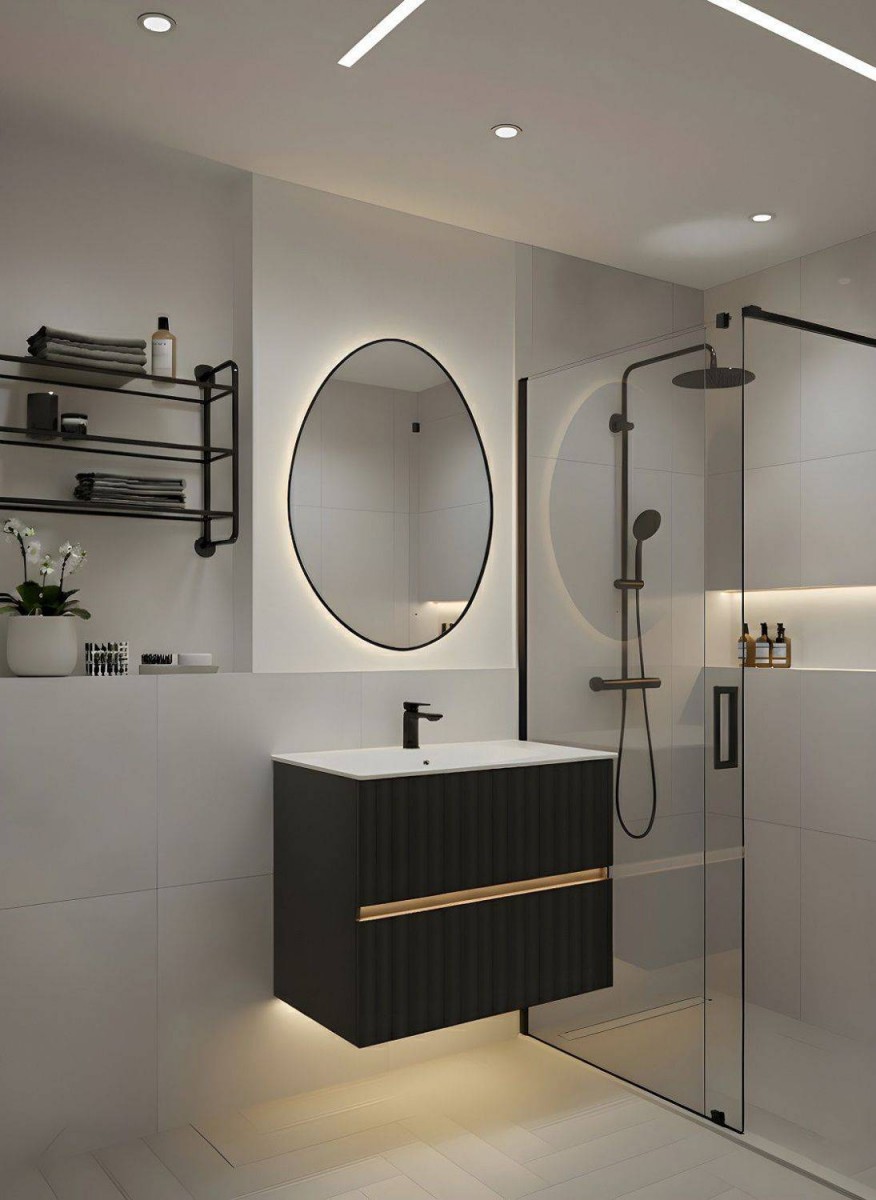 Ореольная подсветка подчеркивает форму зеркала и создает эффект парения.