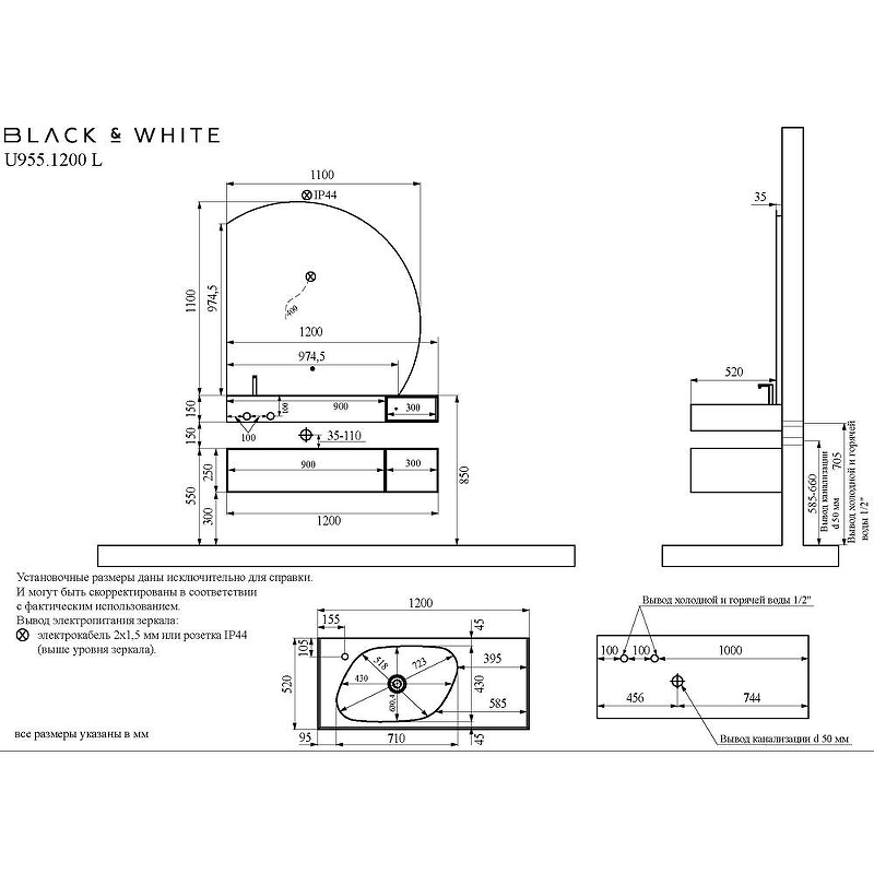 Зеркало Black&White Universe 955.MR1000L 1100*1100 мм (LED,подогрев) L