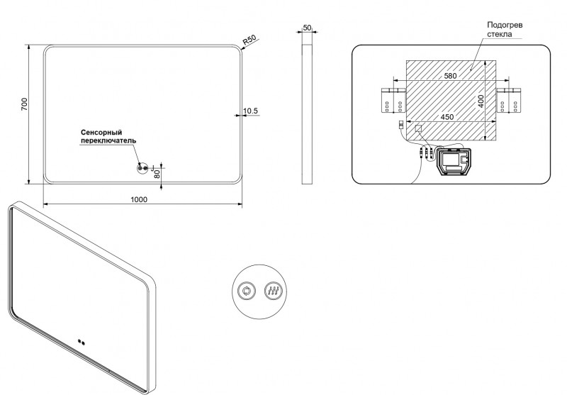 - - Двойной выключатель: регулировка цветовой температуры (2700-6500К) и подогрев полотна;
