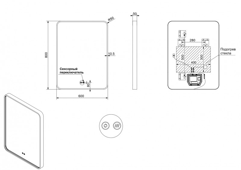 - - Двойной выключатель: регулировка цветовой температуры (2700-6500К) и подогрев полотна;