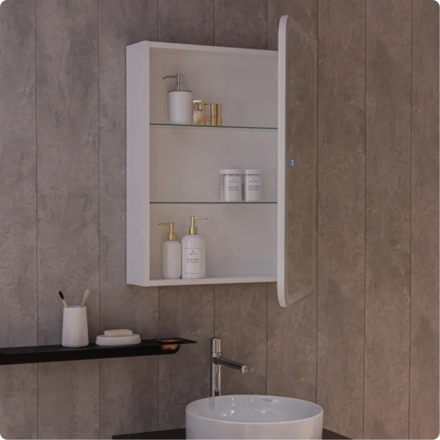 Доводчик для плавного закрывания дверцы и встроенная в боковую часть корпуса розетка делают зеркало-шкаф комфортным в использовании