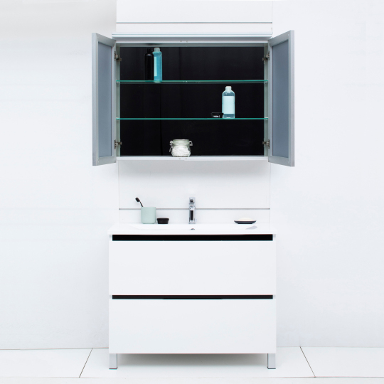 Зеркало-шкаф De Aqua Алюминиум 100 позволит разместить все необходимое в удобном доступе. В своей суровой простоте дизайнерского замысла эта модель обращается к классике минималистичного интерьера. Особенно если учесть размеры изделия: ширину 1000 мм, глубину 140 мм, высоту 765 мм. Алюминий использован для изготовления корпуса зеркального шкафа. Зеркальное полотно скрывает за собой довольно вместительный шкаф. Теперь найдется место для размещения необходимых гигиенических средств, косметики и даже лекарств.