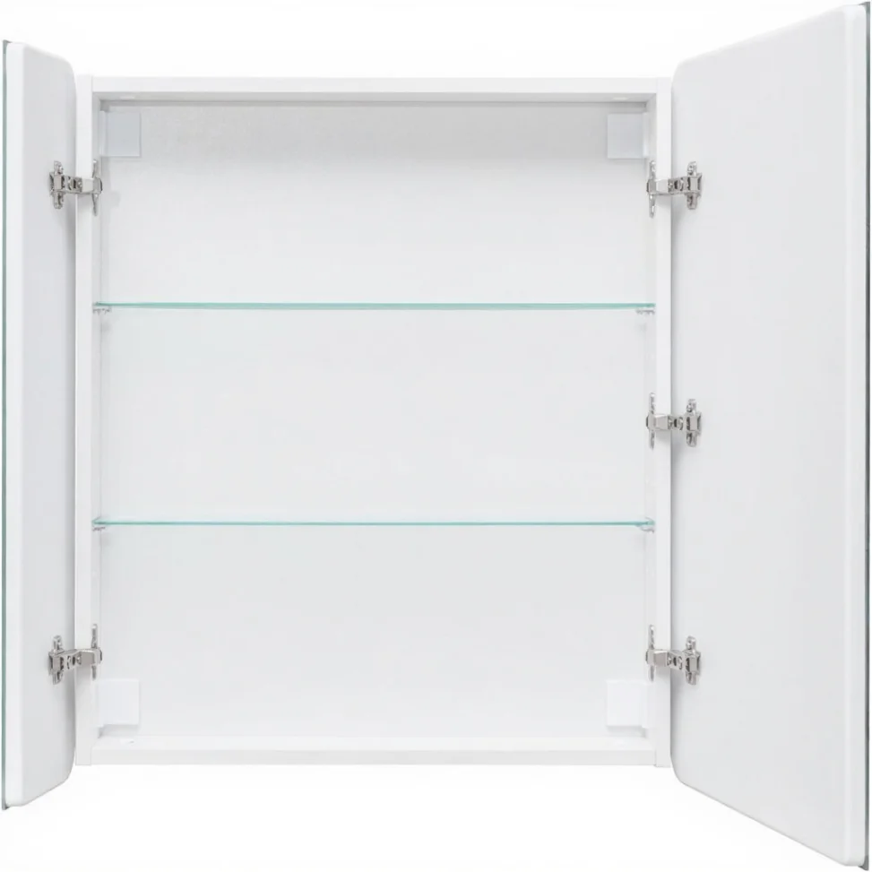 Корпус шкафа выполнен из влагостойкого белого ЛДСП. Он надежно защищен от воздействия влаги и пара. Это гарантирует долгий срок службы даже в условиях сырости. Внутри шкафа расположены съемные полки из прочного стекла толщиной 4 мм. Вы можете легко настроить внутреннее пространство под свои нужды.