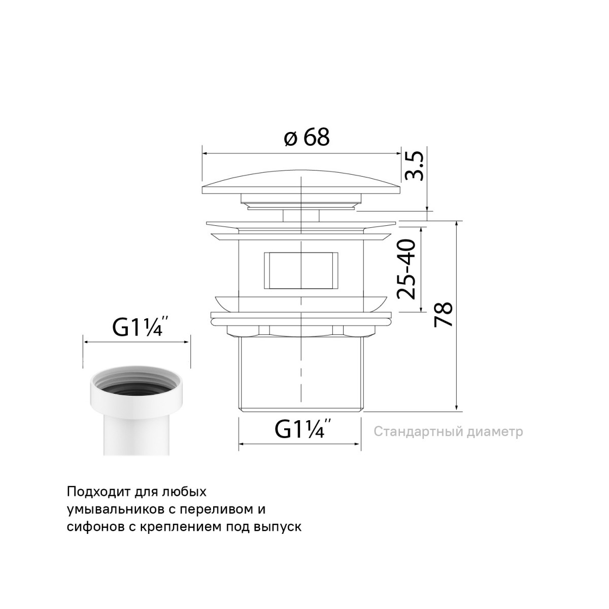 - Подходит для любых умывальников с переливом. Стандартный диаметр 1.1/4” подойдет для любых сифонов с креплением под выпуск.