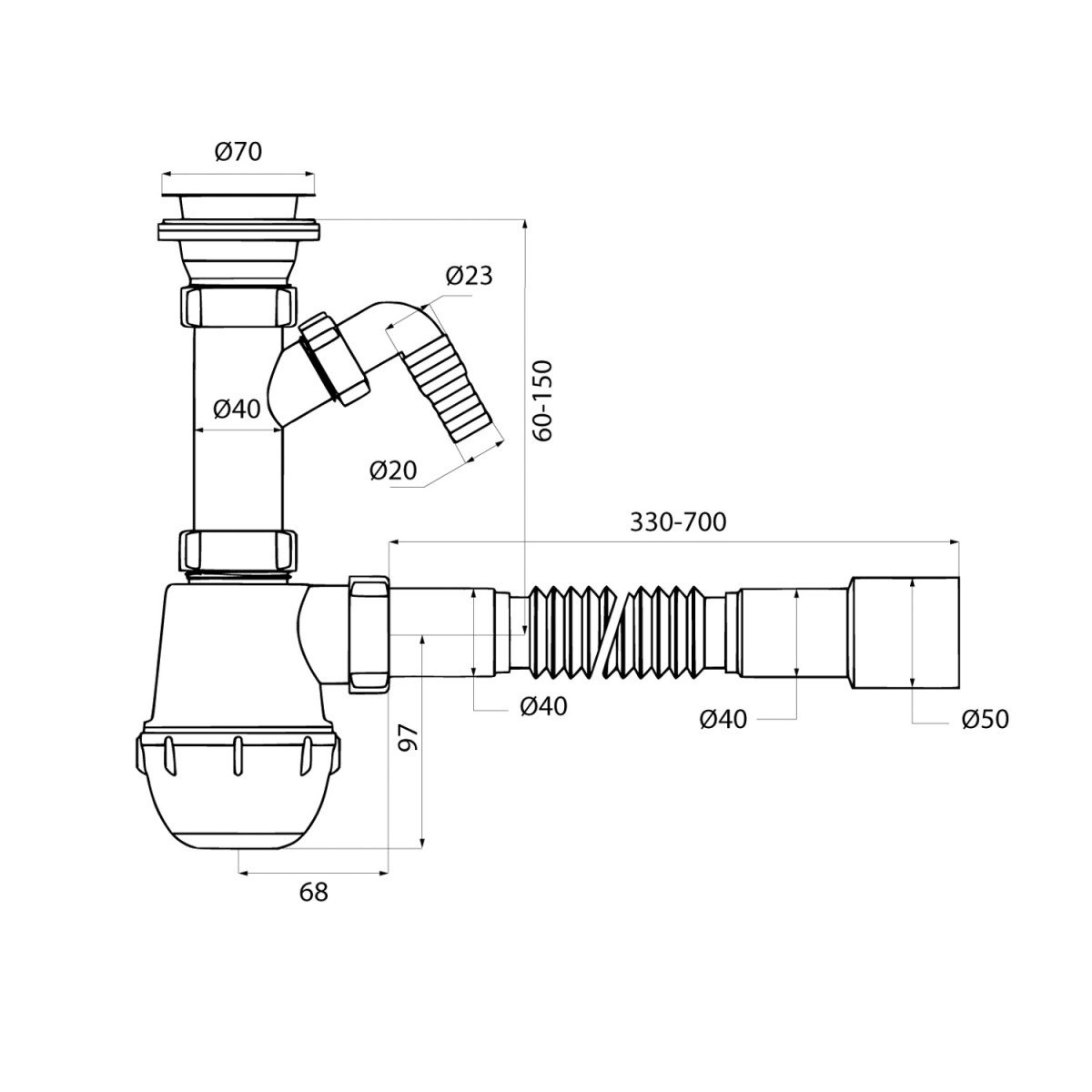• Гофротруба длиной от 330 до 700 мм позволяет установить сифон без точной подгонки под канализационный вывод.