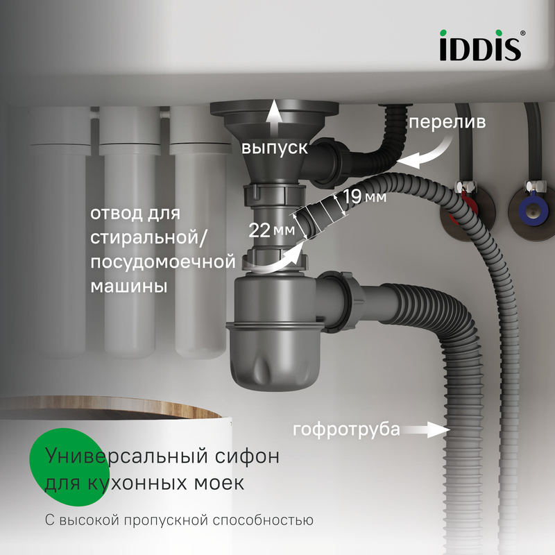 Сифон бутылочный для раковины IDDIS Optima Home 900CVG1P10VD (серый)