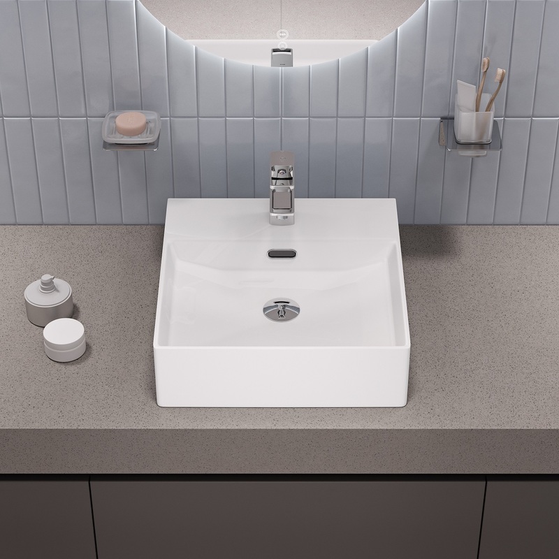 - Стильный умывальник Bild для ванной комнаты актуального лаконичного дизайна с удобной полочкой подойдёт к любому современному интерьеру. Размер 420х420х130 мм. Два варианта установки: подвесной и настольный.