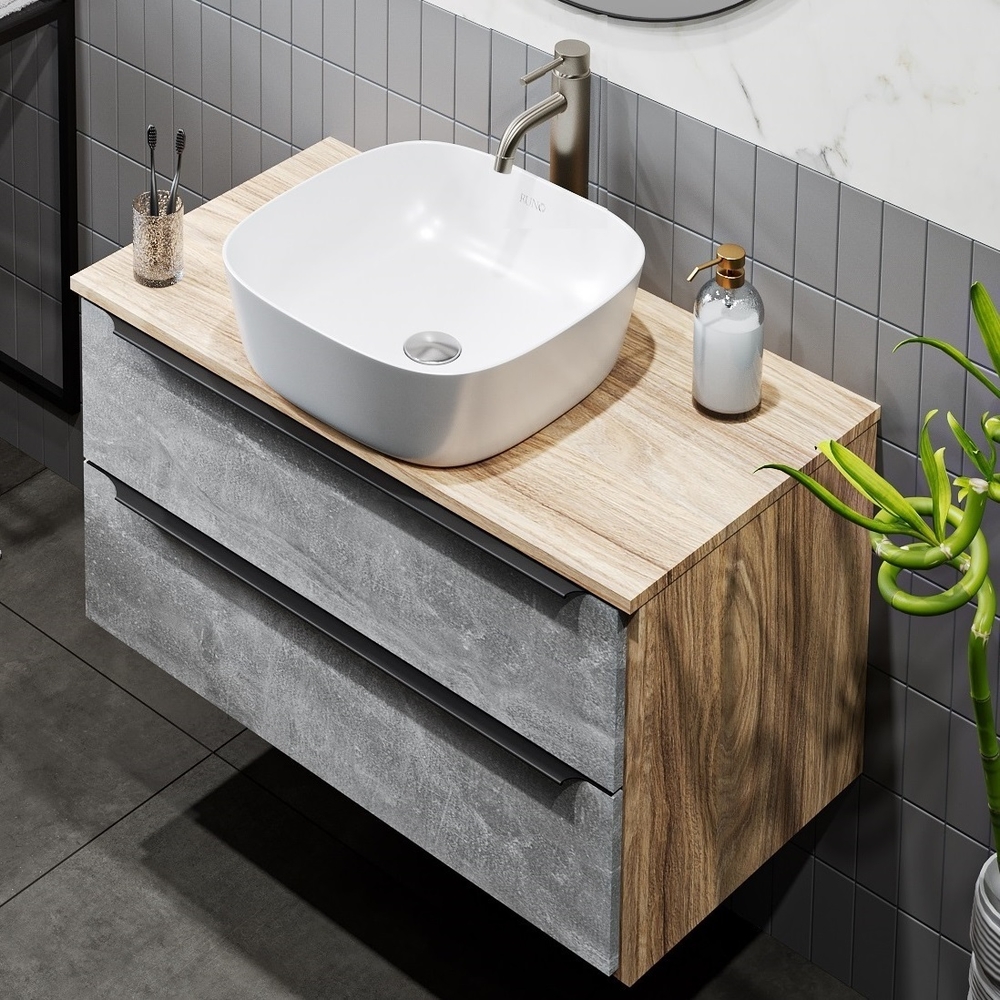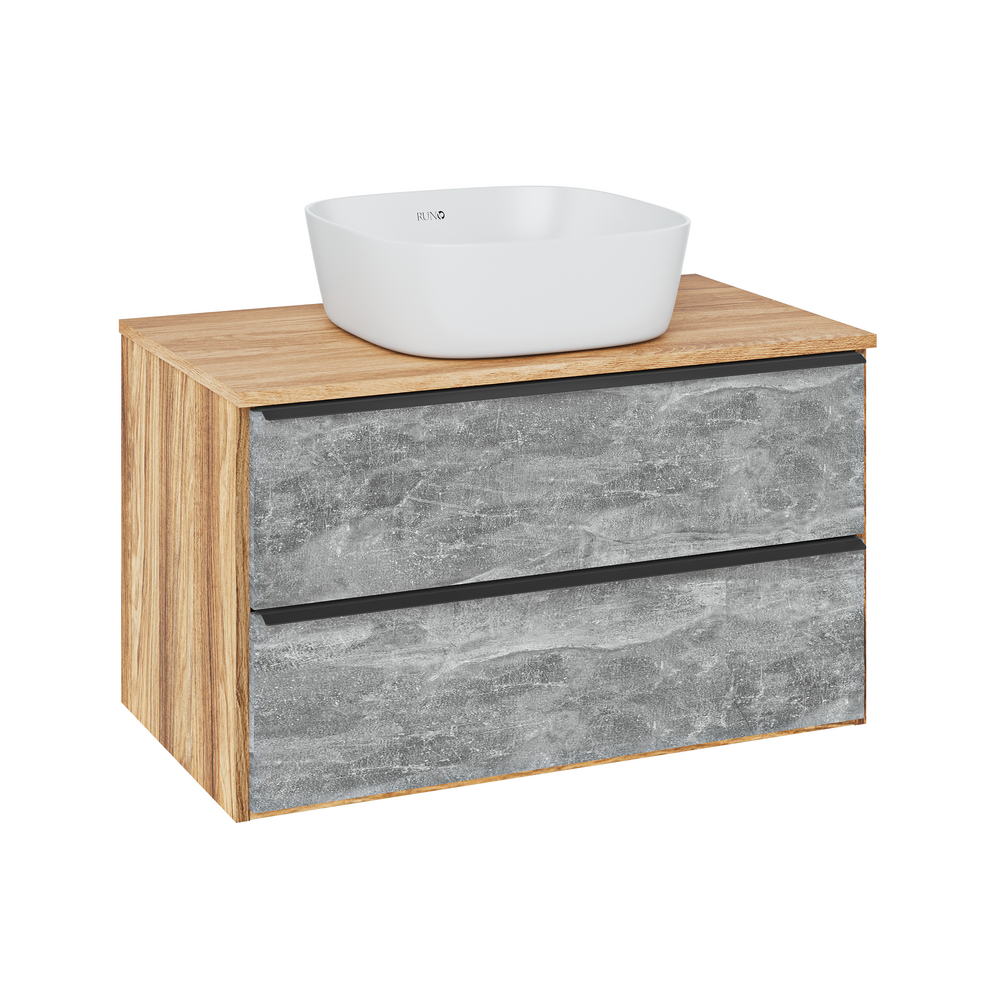Тумба под раковину RUNO МАЛЬТА - выполнена в стильном сочетании древесной текстуры дуба и серого/черного фактурного покрытия.
