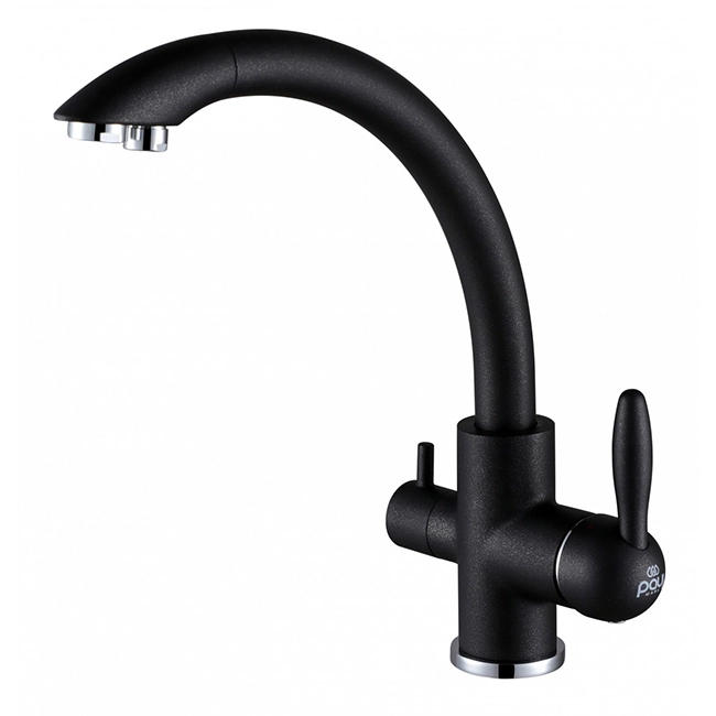 Смеситель для кухни Paulmark Essen Es213001-BLM. Цвет-черный металлик. Отдельный выпуск для фильтрованной воды. Керамический переключатель на фильтр питьевой воды. Съемный пластиковый аэратор, который обеспечивает мягкую струю, ровный и экономичный поток воды. Комплектация: смеситель, гибкая подводка 40 см, усиленный комплект крепления, выход для подключения системы фильтрации питьевой воды, переходник цанга, запасной аэратор