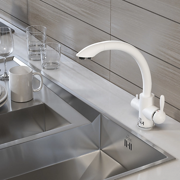 Смеситель для кухни Paulmark Essen Es213001-WH. Цвет-белый матовый. Отдельный выпуск для фильтрованной воды. Керамический переключатель на фильтр питьевой воды. Съемный пластиковый аэратор, который обеспечивает мягкую струю, ровный и экономичный поток воды. Комплектация: смеситель, гибкая подводка 40 см, усиленный комплект крепления, выход для подключения системы фильтрации питьевой воды, переходник цанга, запасной аэратор