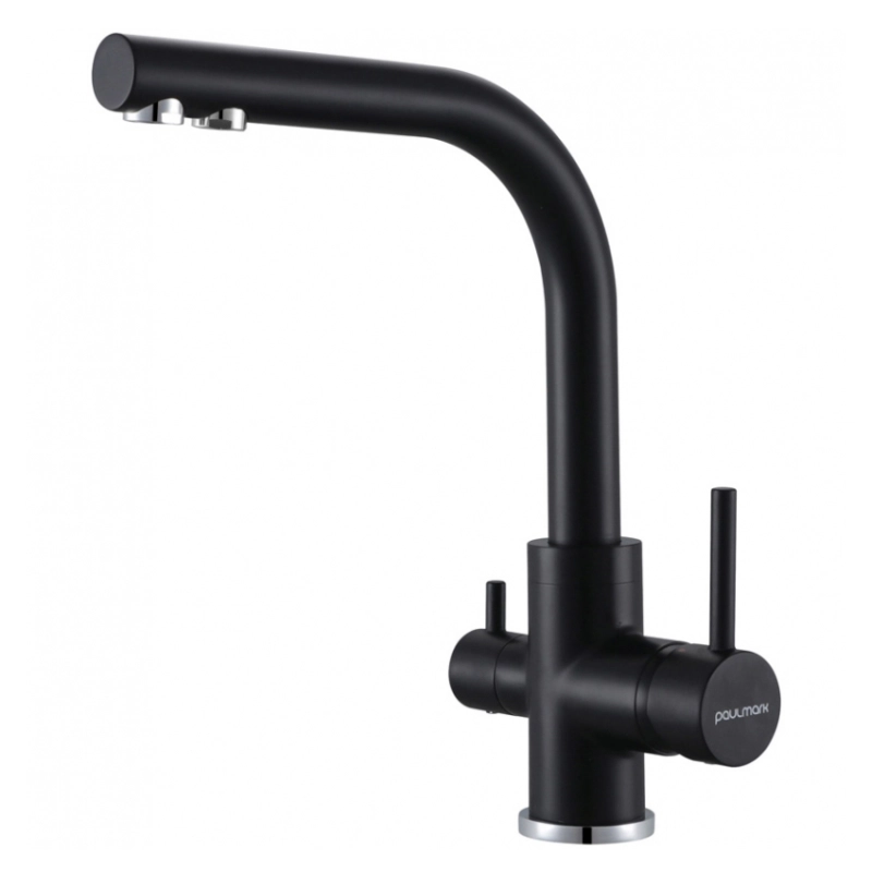 Смеситель для кухни Paulmark Essen Es213011-AN. Цвет-антрацит. Возможность подключения фильтра питьевой воды. Отдельный выпуск для фильтрованной воды. Керамический картридж. Современная форма идеальна для создания уникального дизайна вашей кухни. В комплект поставки входит: смеситель, гибкая подводка 40 см, комплект крепления, переходник цанга для подключения системы фильтрации питьевой воды, запасной аэратор