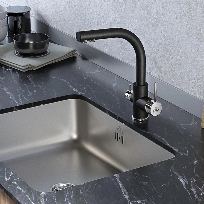 Смеситель для кухни Paulmark Essen Es213011-BLM от производителя сантехники Paulmark. Монтаж кухонного смесителя на мойку имеет преимущества, связанные с удобством использования и функциональностью. Однорычажный механизм прост в управлении, регулируя напор и температуру воды одной рукой. Чёрный цвет выглядит стильно и становится ярким акцентом в современных помещениях. Латунный материал устойчив к коррозии и долговечен, что делает его надежным выбором. Матовое покрытие меньше показывает отпечатки пальцев и водяные разводы, упрощая уход за смесителем. Поворотный излив расширяет функциональность, позволяя использовать смеситель в разных местах. Фильтр для питьевой воды очищает воду, делая её безопасной для питья прямо из смесителя. Смеситель для кухни Paulmark Essen Es213011-BLM имеет гарантию 5 лет.