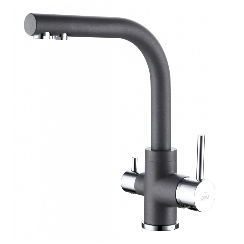 Смеситель для кухни Paulmark Essen Es213011-GRM с возможностью подключения фильтра питьевой воды, керамический картридж 35 мм. Цвет-серый металлик. Комплектация: смеситель, гибкая подводка 40 см, комплект крепления, переходник цанга для подключения системы фильтрации питьевой воды, запасной аэратор