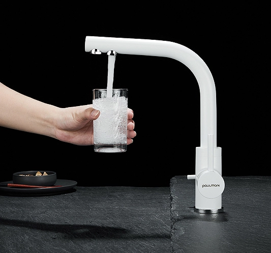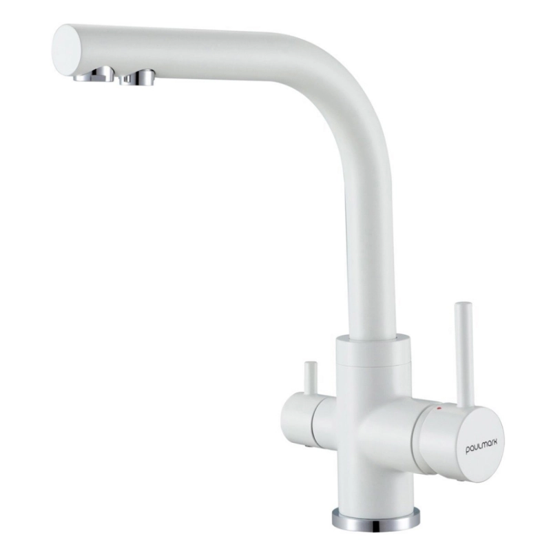 Смеситель для кухни Paulmark Essen Es213011-WH. Цвет-белый матовый. Возможность подключения фильтра питьевой воды. Отдельный выпуск для фильтрованной воды. Керамический картридж. Современная форма идеальна для создания уникального дизайна вашей кухни. В комплект поставки входит: смеситель, гибкая подводка 40 см, комплект крепления, переходник цанга для подключения системы фильтрации питьевой воды, запасной аэратор
