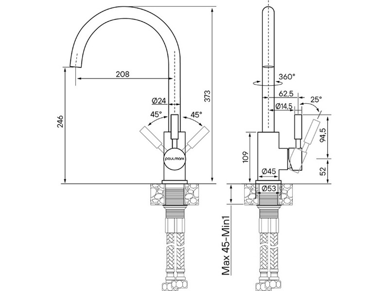 Смеситель для кухни Paulmark Holstein Ho212063-BS. Цвет-сталь. Комплектация: смеситель, гибкая подводка из нержавеющей стали 40 см, усиленный комплект крепления, запасной аэратор
