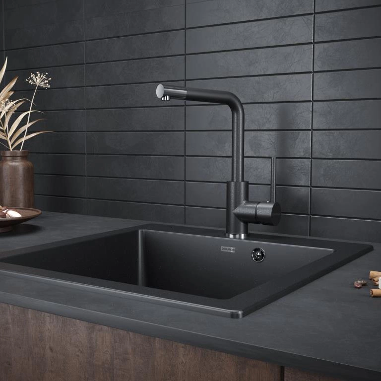 Смеситель для кухни Paulmark Honner Ho212018-BLM. Цвет-черный. Керамический картридж. Комплектация: смеситель, гибкая подводка из нержавеющей стали 40 см, усиленный комплект крепления, запасной аэратор