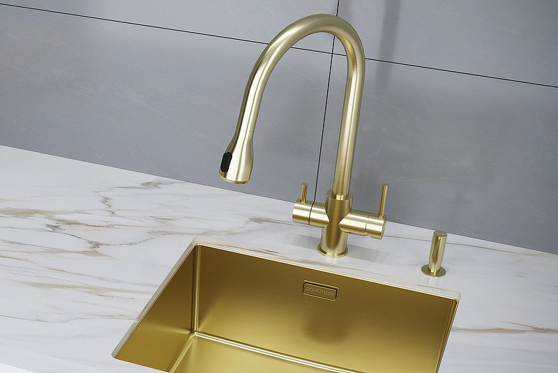 Смеситель для кухни Paulmark Lange La214212-LG. Цвет-светлое золото. Излив: выдвижной, гибкий, поворотный. Возможность подключения системы фильтрации питьевой воды. Функции струя и душ. Комплектация: смеситель, гибкая подводка для воды, 50 см, усиленный комплект креплений, выход для подключения системы фильтрации воды, переходник цанга для подключения фильтра
