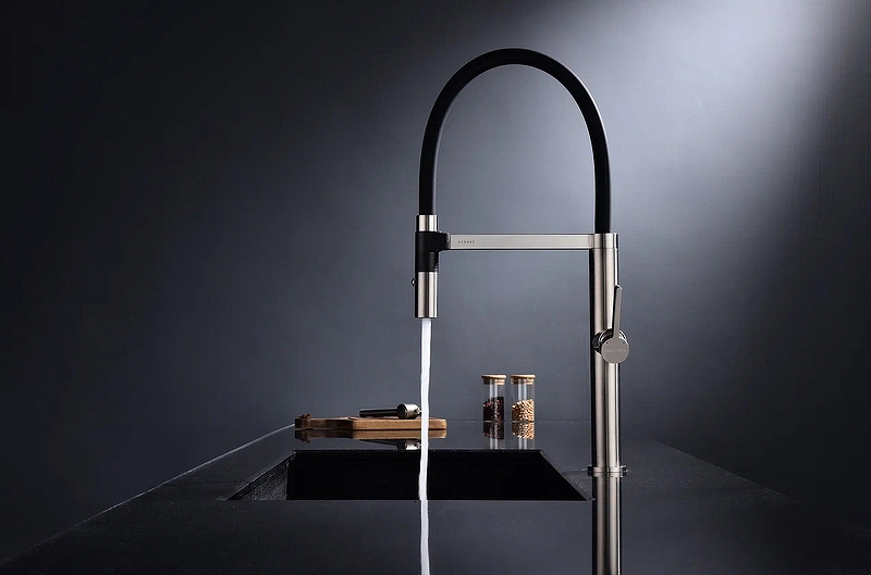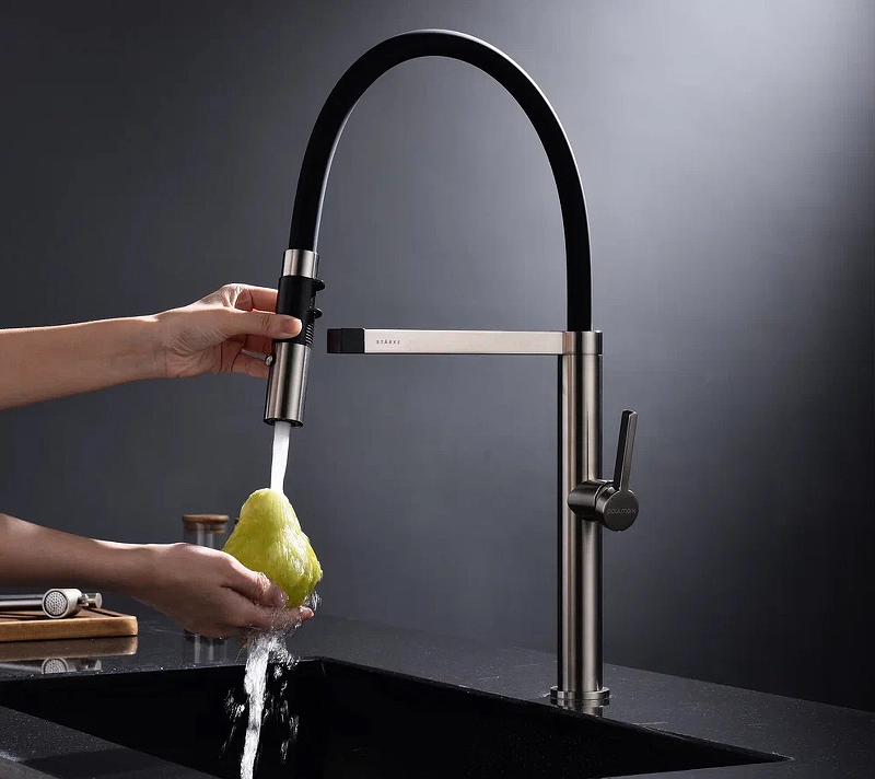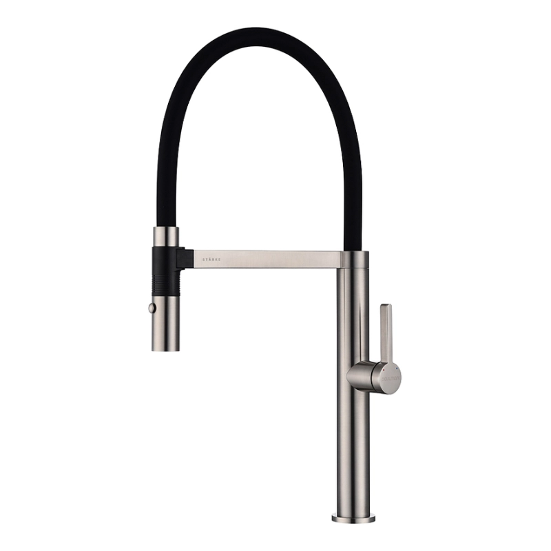 Смеситель для кухни Paulmark Leader Le214101-BS. Цвет-сталь. Излив: гибкий, поворотный. Функции: струя, душ. Комплектация: смеситель, гибкая подводка 40 см, усиленный комплект крепления