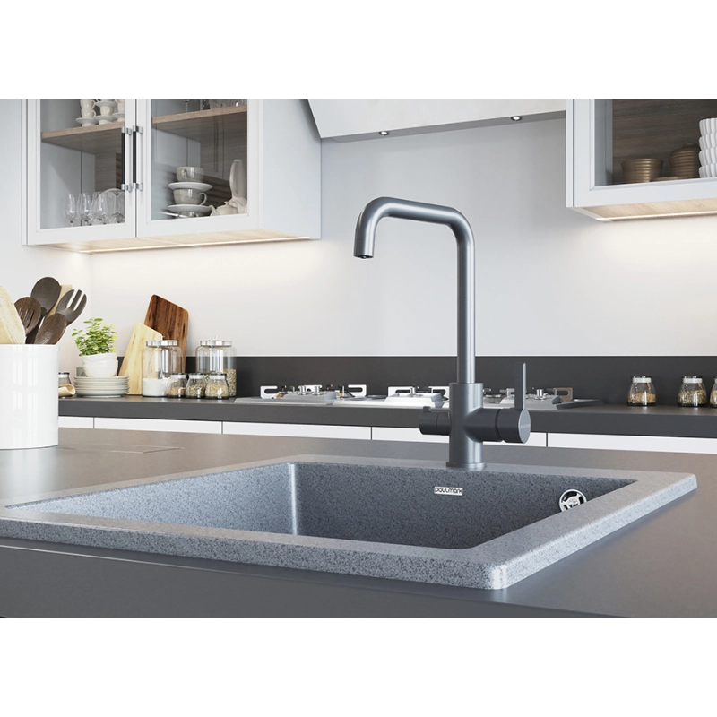 Смеситель для кухни Paulmark Logas Lo213021-GRM. Цвет-серый металлик. Возможность подключения системы фильтрации питьевой воды. Комплектация: смеситель, гибкая подводка для воды 40 см, комплект крепления, переходник цанга для подключения системы фильтрации питьевой воды
