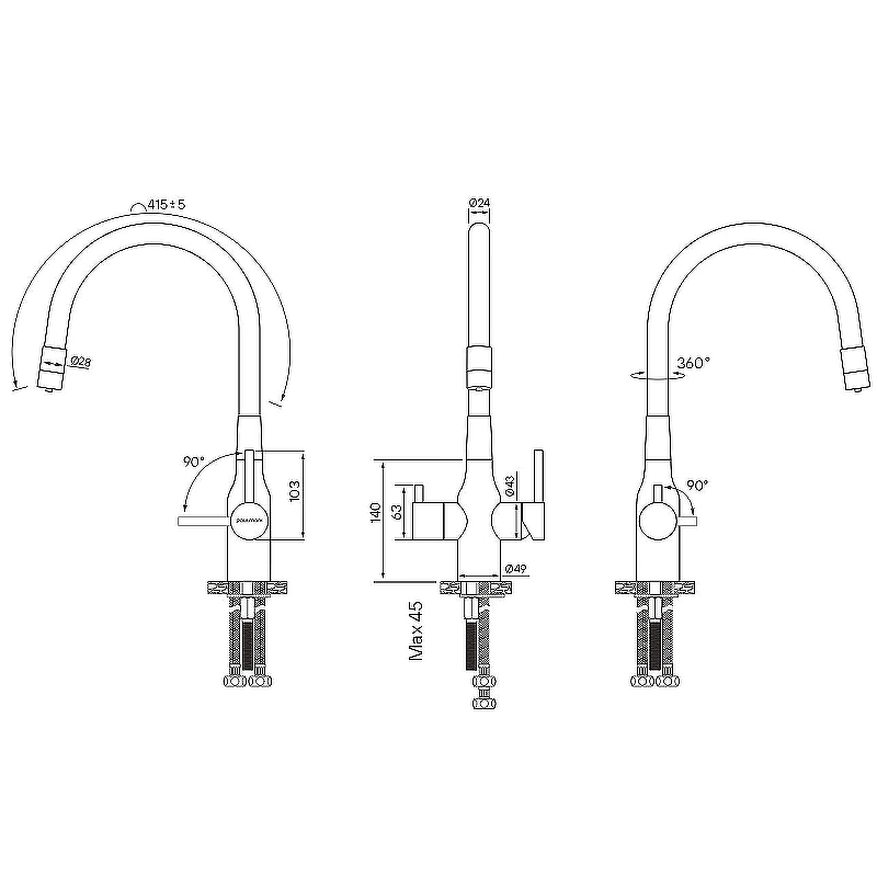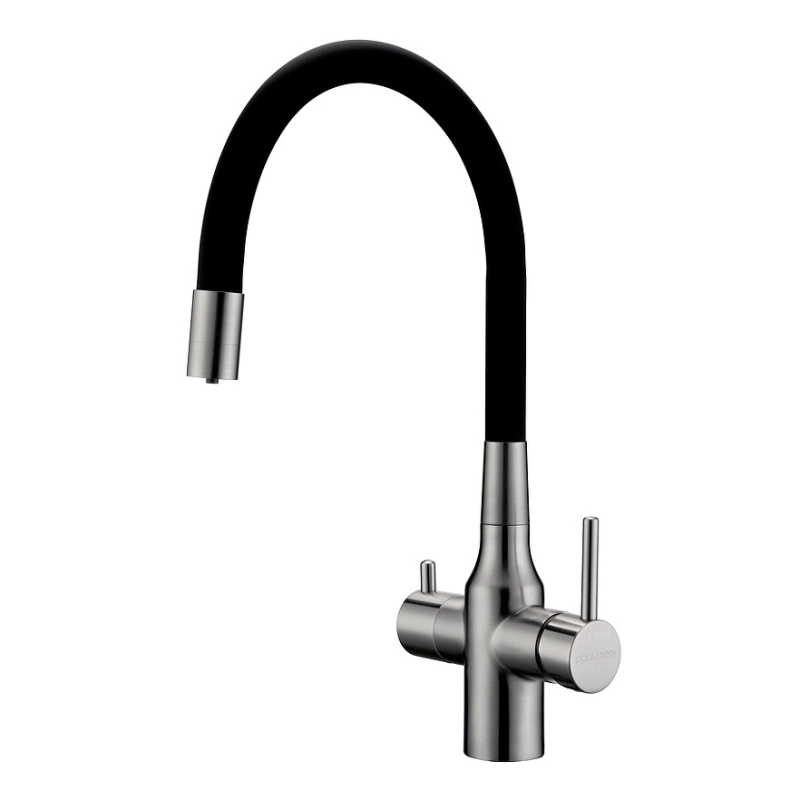 Смеситель для кухни Paulmark Salix Sa213419-BS. Цвет-сталь. С возможностью подключения фильтра питьевой воды, эластичный излив с фиксацией. Комплектация: смеситель, гибкая подводка для воды, 40 см, выход для подключения системы фильтрации воды, усиленный комплект креплений, переходник цанга для подключения фильтра