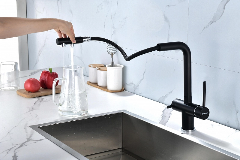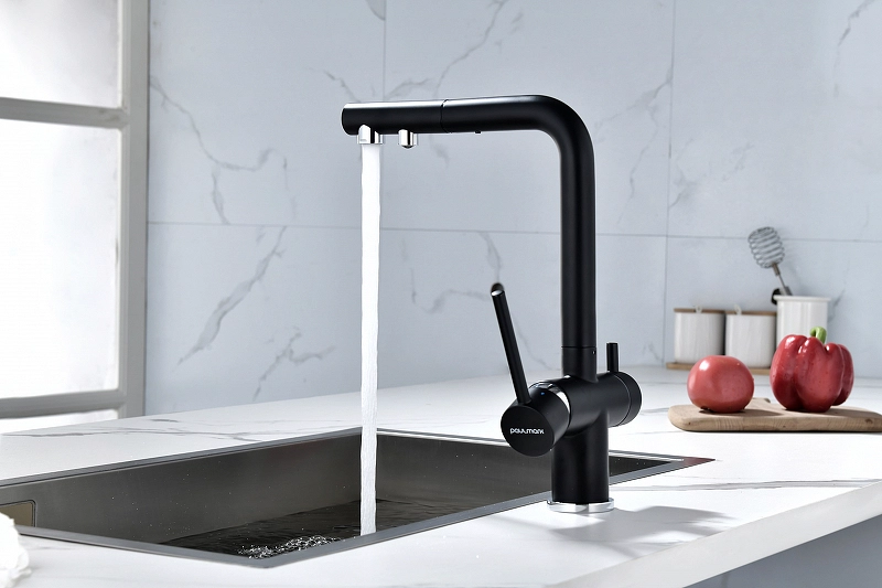 Смеситель для кухни Paulmark Serpentine Se213222-AN. Цвет-антрацит. С возможностью подключения фильтра питьевой воды, с выдвижным изливом. Комплектация: смеситель, гибкая подводка для воды, выход для подключения системы фильтрации воды, усиленный комплект креплений, переходник цанга для подключения фильтра