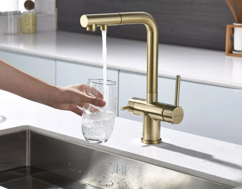 Смеситель для кухни Paulmark Serpentine Se213222-LG. Цвет-светлое золото. Комплектация: смеситель, гибкая подводка в оплётке из нейлоновой нити 40 см, усиленный комплект крепления, выход для подключения системы фильтрации питьевой воды, переходник цанга для подключения системы фильтрации питьевой воды