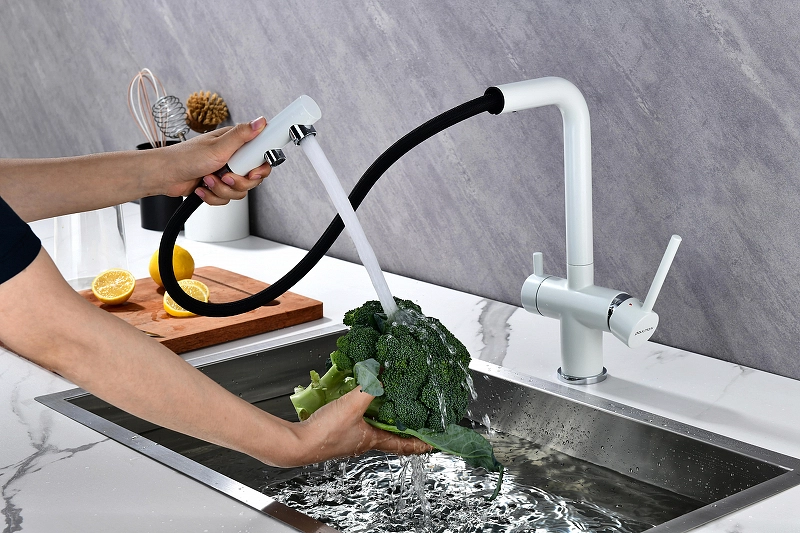 Смеситель для кухни Paulmark Serpentine Se213222-WH. Цвет-белый матовый. С возможностью подключения фильтра питьевой воды, с выдвижным изливом. Комплектация: смеситель, гибкая подводка для воды, выход для подключения системы фильтрации воды, усиленный комплект креплений, переходник цанга для подключения фильтра