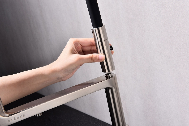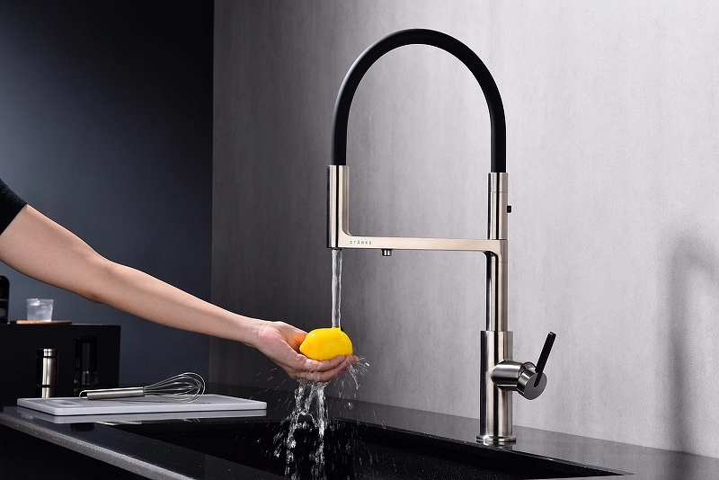 Смеситель для кухни Paulmark Tornado To213402-BS. Цвет-сталь, черный. Возможность подключения системы фильтрации питьевой воды. Отдельное управление потоком питьевой воды. Керамический картридж. Комплектация: смеситель, гибкая подводка 40 см, усиленный комплект крепления, выход для подключения системы фильтрации питьевой воды, переходник цанга для подключения системы фильтрации питьевой воды