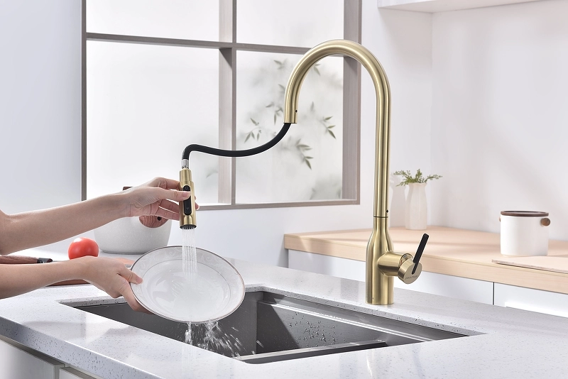 Смеситель для кухни Paulmark Universal Un213880-LG. Цвет-светлое золото. Оснащен функциями подключения фильтра питьевой воды, выдвижения излива и двумя режимами подачи водопроводной воды: струя и душ. Выдвижной излив дает свободу в наполнении емкостей не только в мойке, но и рядом с мойкой на столешнице. Кнопка на конце излива позволяет управлять подачей питьевой воды и переключением режимов. Комплектация: смеситель, гибкая подводка 60 см, усиленный комплект креплений, выход для подключения системы фильтрации воды, переходник для подключения фильтра, запасной аэратор