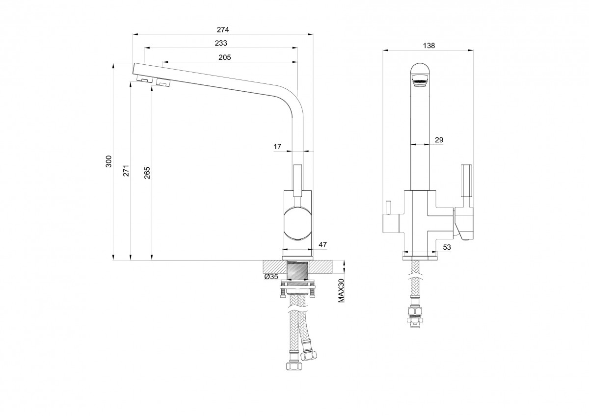 - Комплектация Смеситель / Гибкая подводка / Монтажный комплект