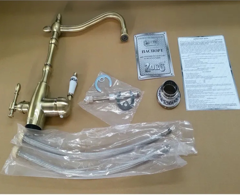 Технология комбинированного смесителя Зорг два в одном позволяет получать водопроводную и очищенную воду из одного смесителя. Благодаря "двойному каналу" в изливе смесителя ZORG ZR 312 YF-50 GOLD SATIN, вода подается не смешиваясь по разным каналам. Рычаг управления водопроводной водой справа от излива, управление питьевой водой - слева.