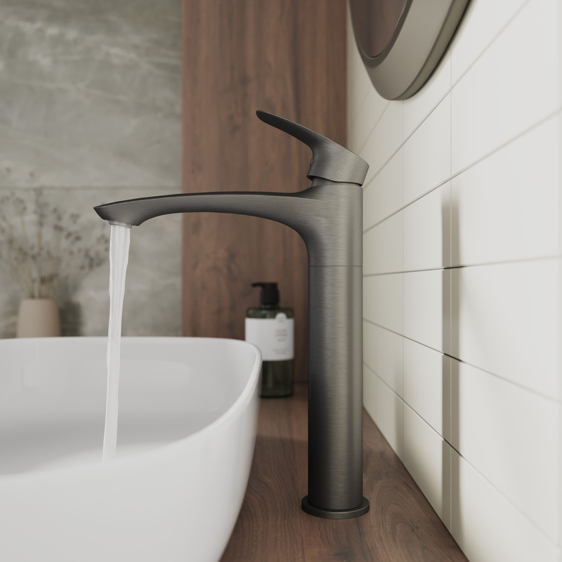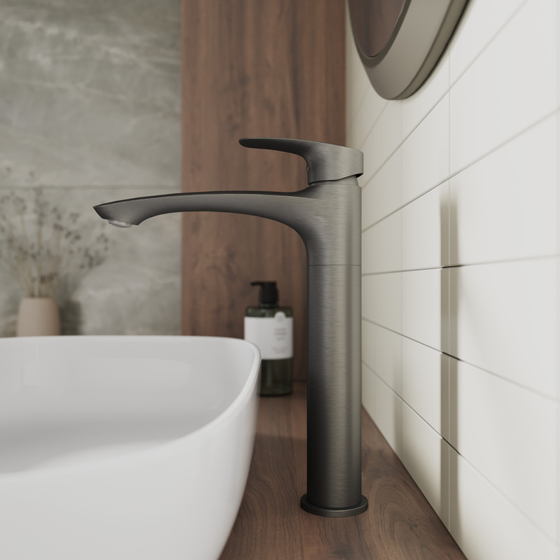 Смеситель для умывальника Rora отличается универсальным характером: основной акцент в его дизайне приходится на плавные линии корпуса и трендовый цвет. Модель в графитовом цвете одинаково выигрышно смотрится на контрастных белоснежных раковинах и дополняет собой керамику темных оттенков. Высокий смеситель (290 мм) подходит для установки с накладными раковинами-чашами. В комплекте гибкая подводка и крепеж.