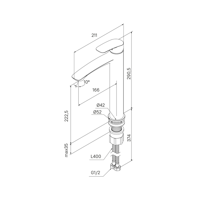 | Подключение к системе водоснабжения: | Гибкая подводка из нетоксичной EPDM резины в оплетке из нержавеющей стали, М10 - 1/2, длина 400 мм |