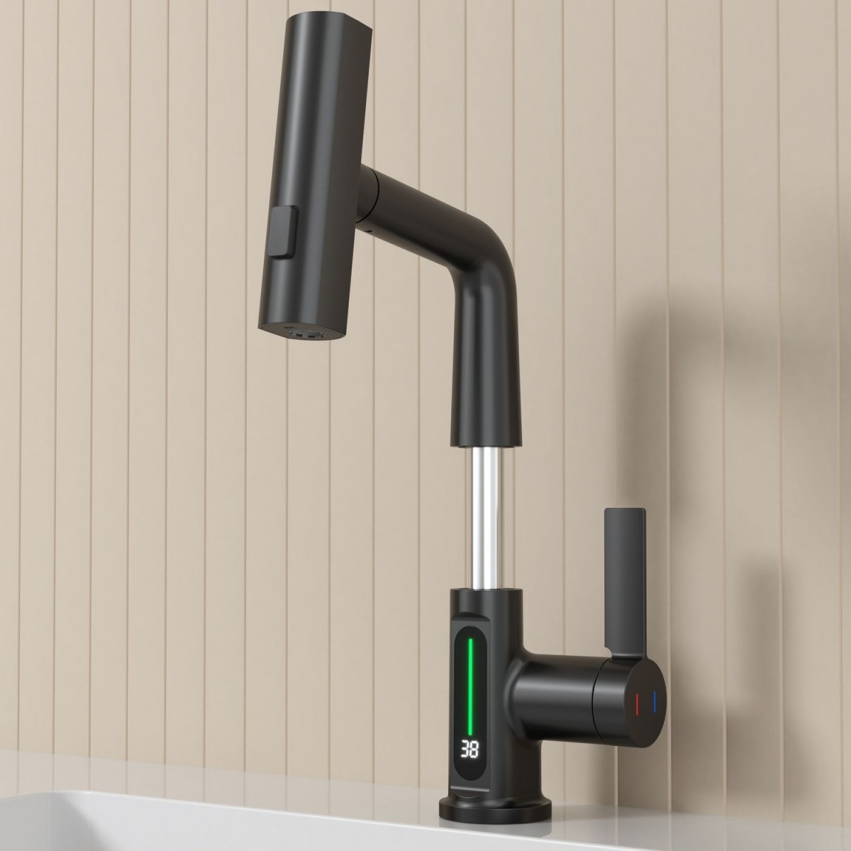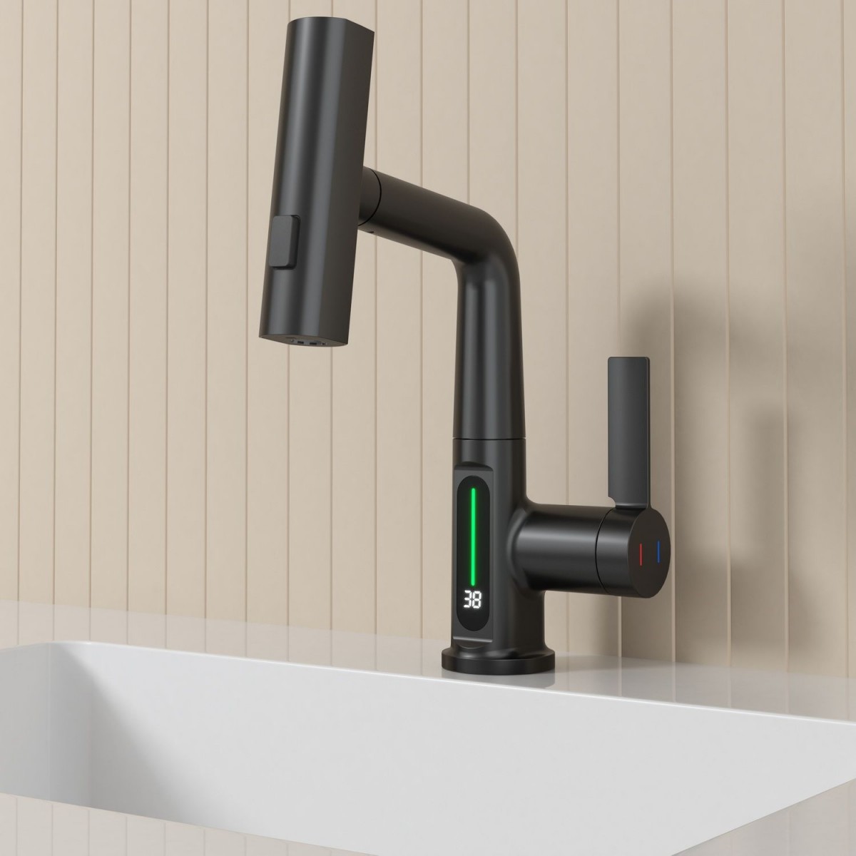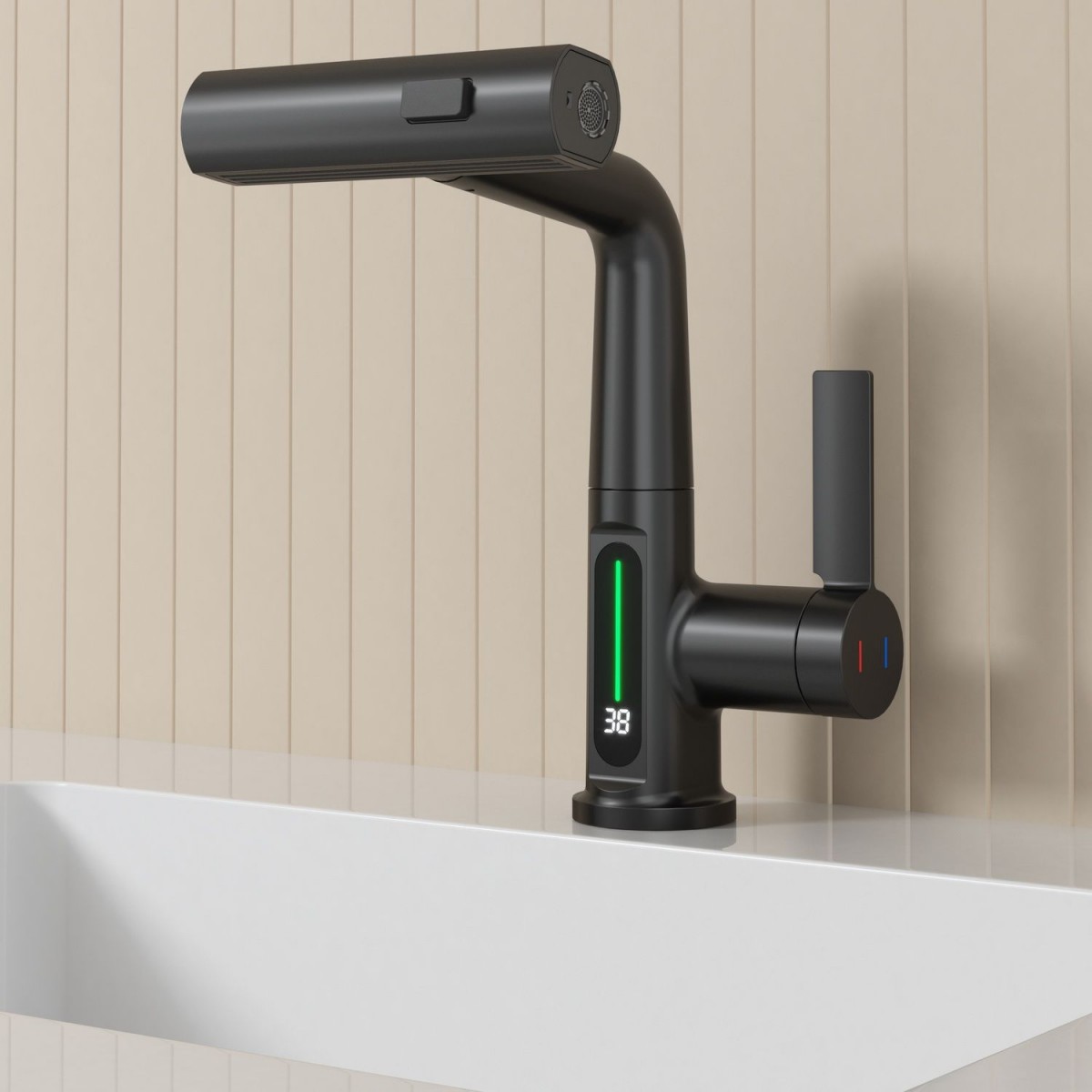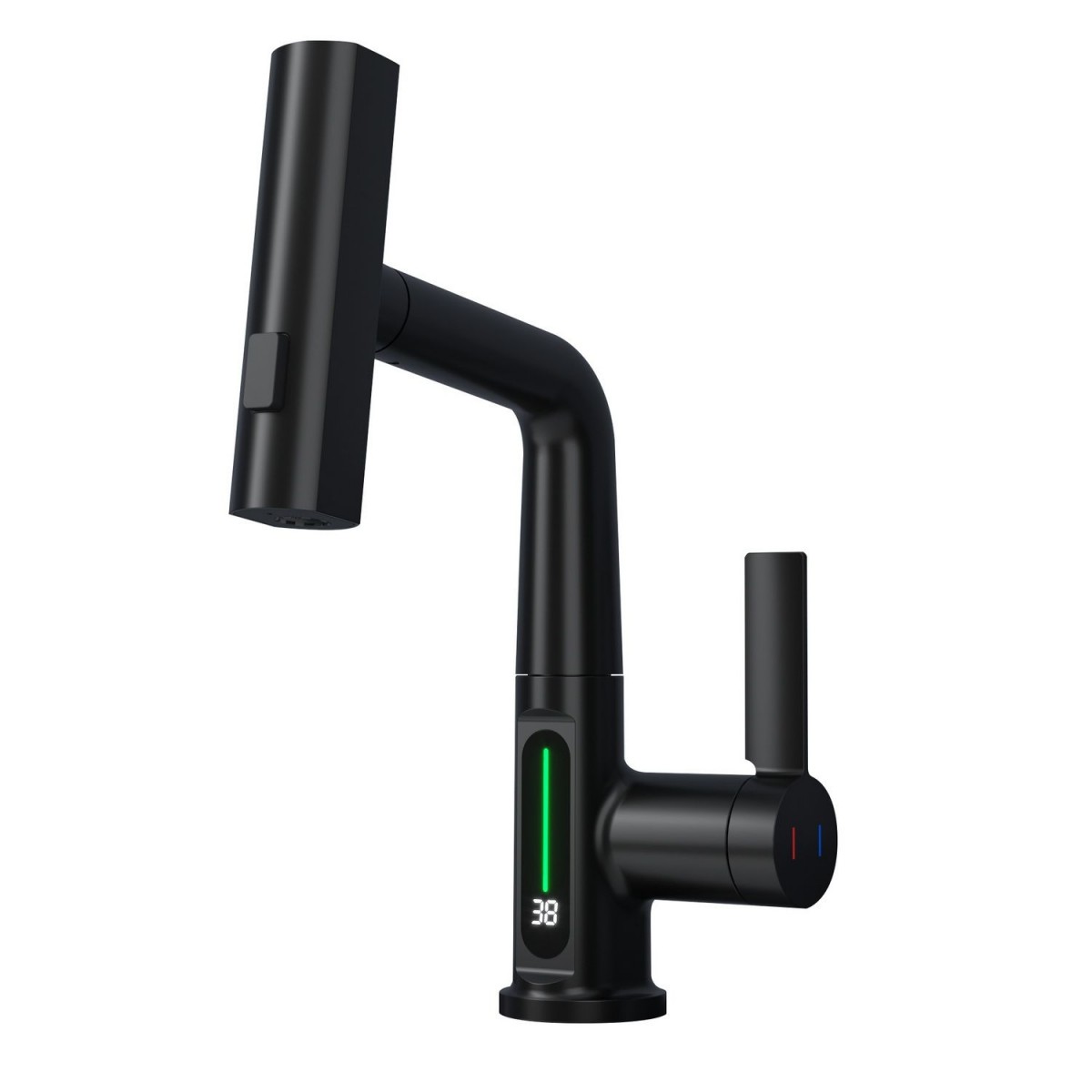 Смеситель для раковины датского производителя Black&White в черном матовом цвете. Корпус изделия выполнен из сантехнической латуни для увеличенного запаса прочности, а также исключает возможность появление коррозии. Управление потоком воды осуществляется с помощью керамического картриджа повышенной пропускной способности. Инновационным решением можно отметить электронное табло, расположенное в нижней части корпуса, на которое выводится показание температуры воды с подсветкой красного, зеленого и синего цвета. В данном продукте реализован многофункциональный излив с возможностью настройки высоты и длинны с помощью вытяжного шланга. Аэратор смесителя оборудован несколькими видами подачи воды, которые переключаются с помощью кнопки расположенной сверху корпуса. SD 3027- изделие для Вашего комфорта и удобства, а расширенный функционал излива поможет в выполнении бытовых задач.