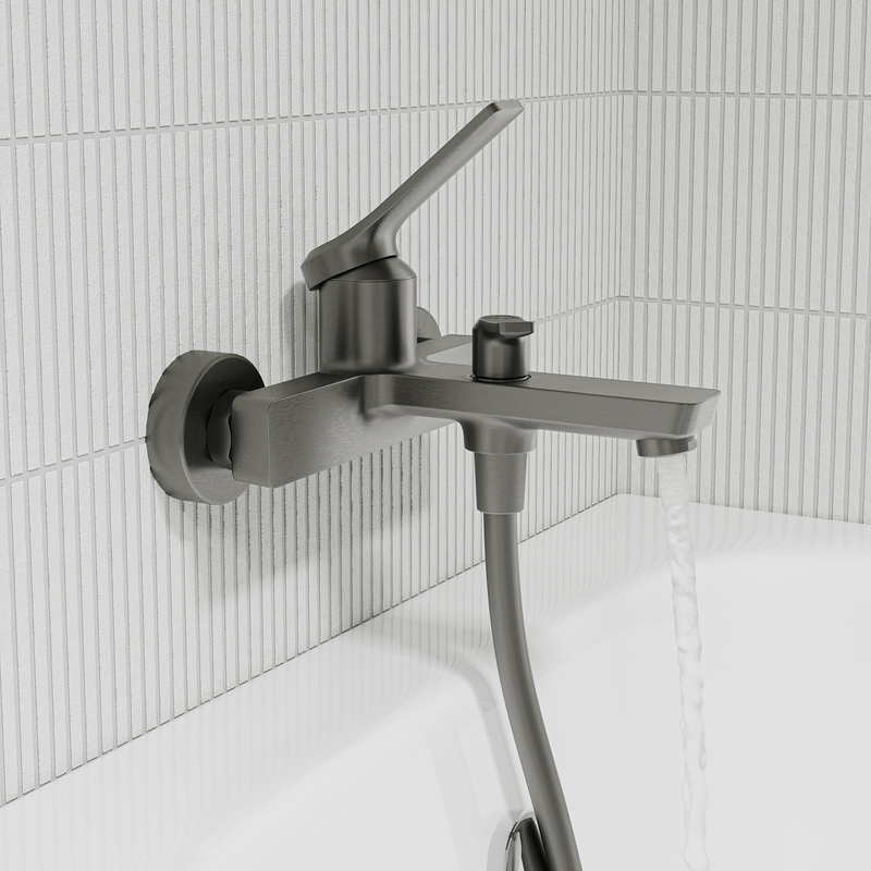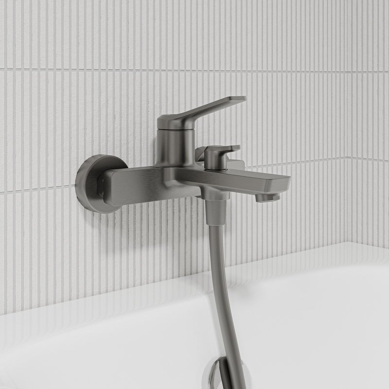 Смеситель для ванны Parker в трендовом оттенке матового графита – практичный и стильный, его дизайн сочетает в себе трендовый минимализм форм и четкие грани. Ручка изящно смотрит вверх под углом, освобождая под собой место для более удобного захвата. Без душевых аксессуаров в комплекте.