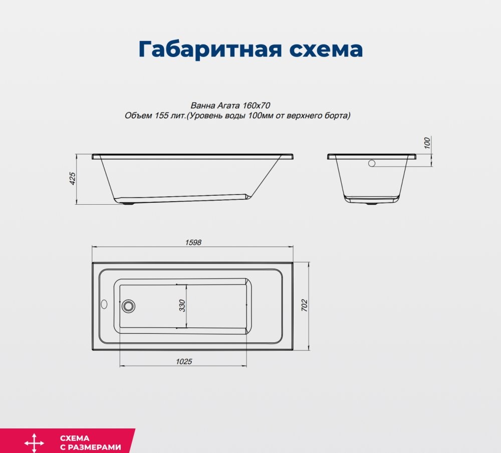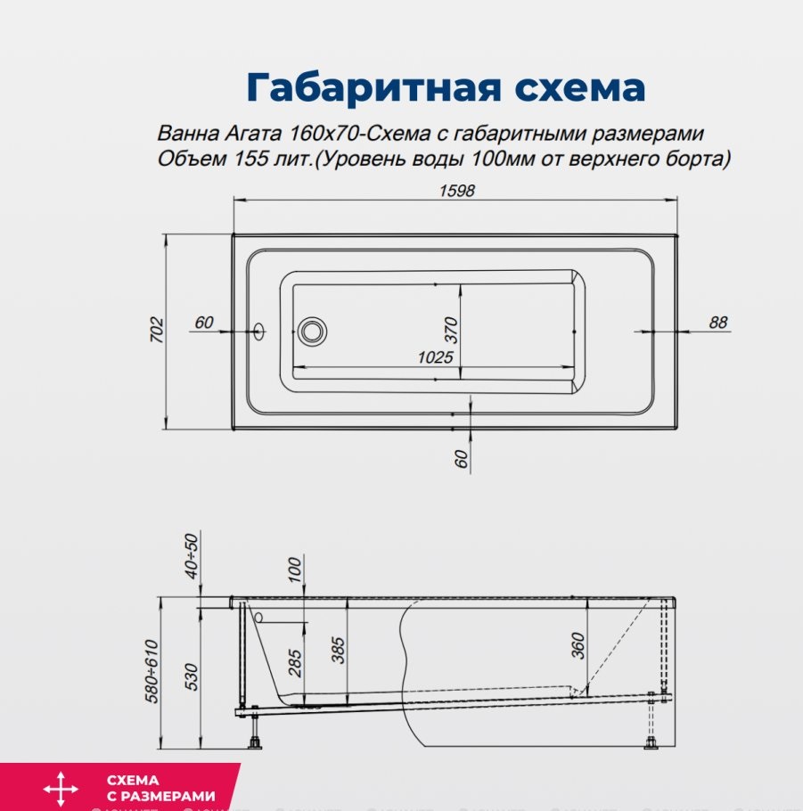 Ванна акриловая Aquanet Agata 369252 1600*700 мм (белый) с каркасом