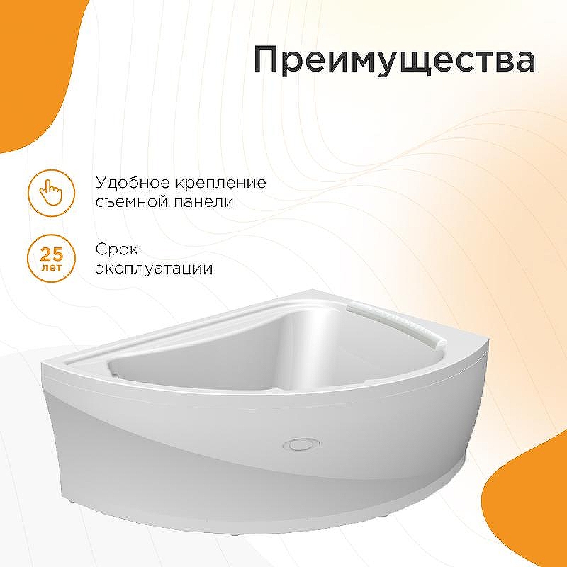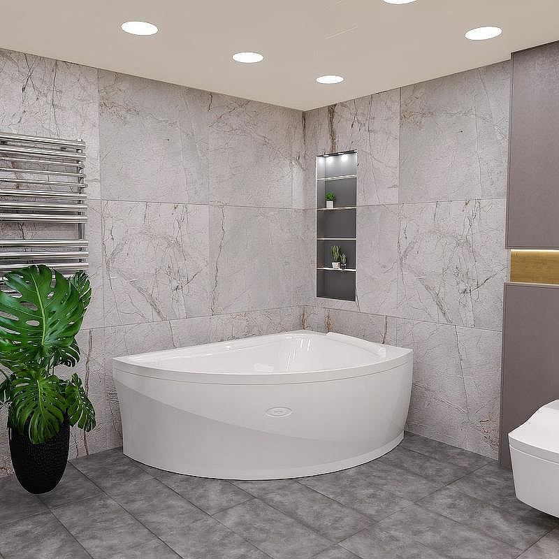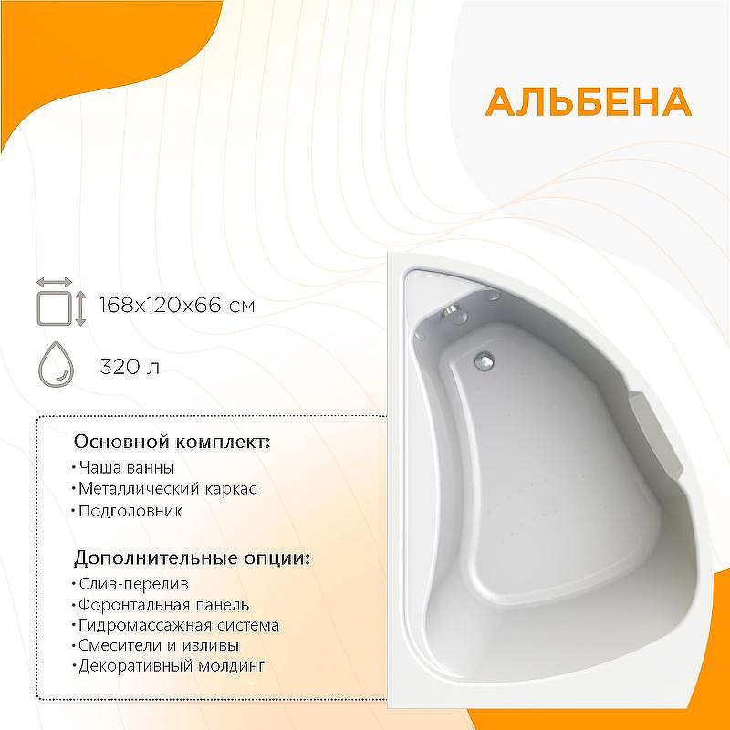 Акриловая угловая ванна Альбена 168х120 притягивает взгляд совершенством формы и эргономичным внутренним пространством.