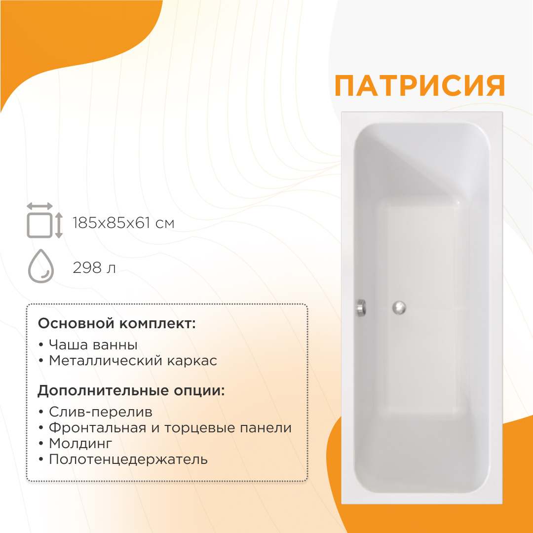 - Представляем нашу новую линейку акриловых ванн "Патрисия" - стильные прямоугольные модели со сливом-переливом в центре чаши.