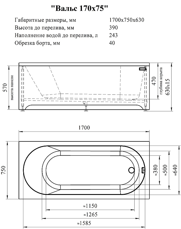 Ванна акриловая Radomir Вальс 1-01-0-0-1-337 170*75 см (белый) с каркасом
