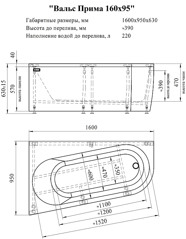 Ванна акриловая Radomir Вальс Прима 1-01-0-2-1-352 160*95 см (белый) R с каркасом