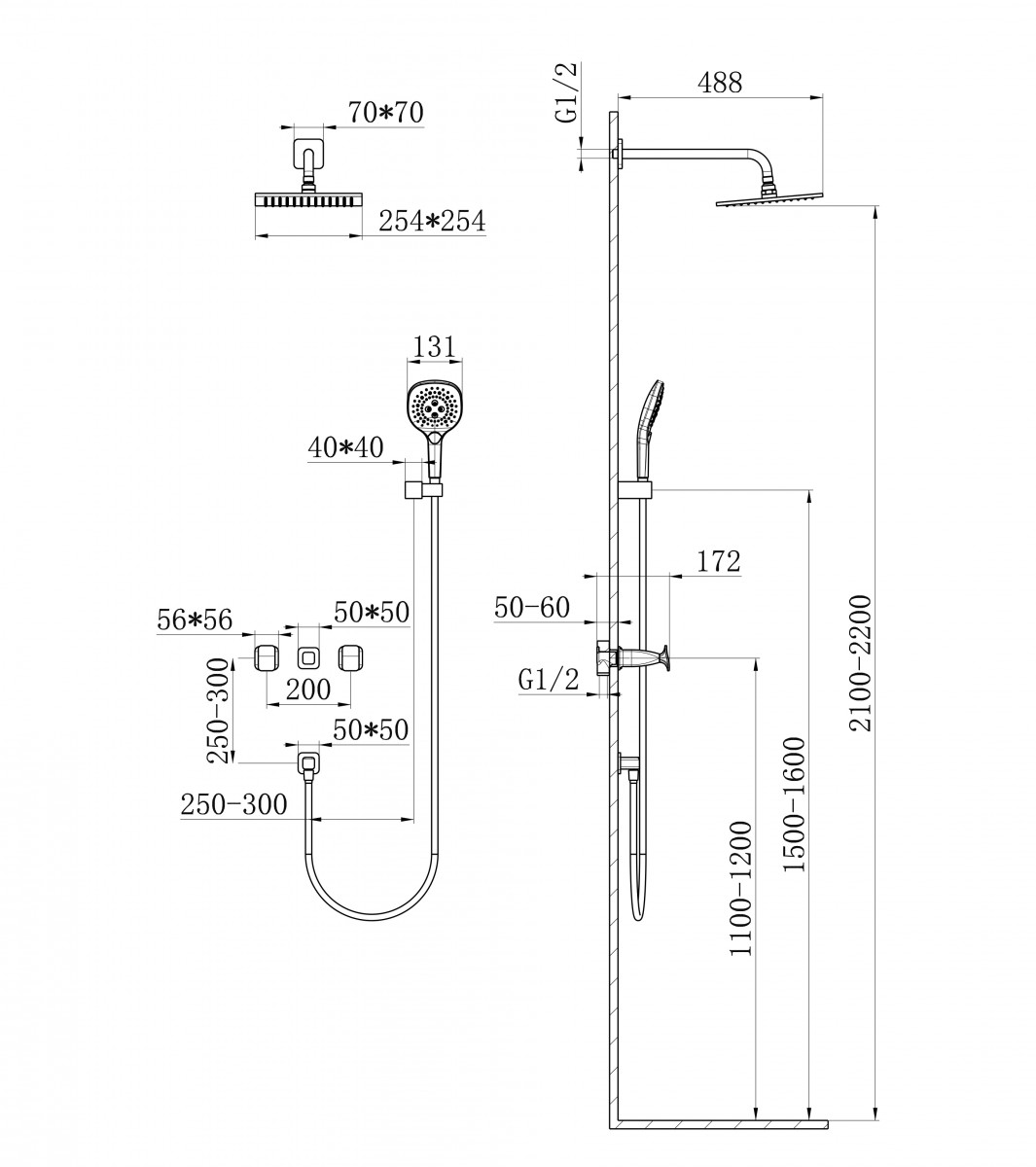 - Комплектация Смеситель / Душевой шланг/ Держатель для душа / Верхний душ / Душевая лейка / Монтажный комплект
