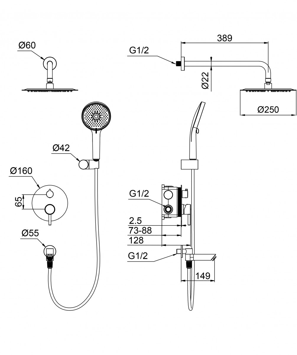 - Комплектация Смеситель / Душевой шланг/ Держатель для душа / Верхний душ / Душевая лейка / Монтажный комплект