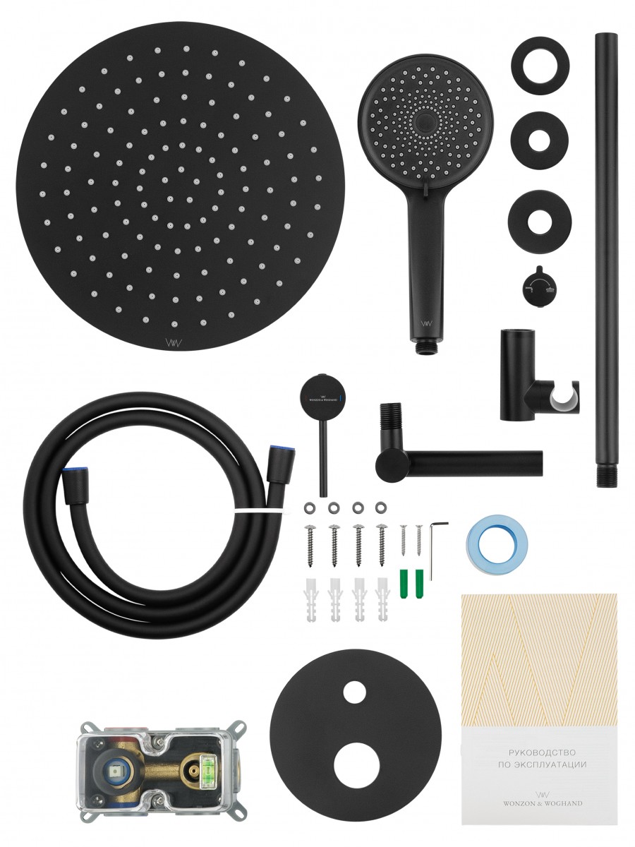 - Комплектация Смеситель / Душевой шланг/ Держатель для душа / Верхний душ / Душевая лейка / Монтажный комплект