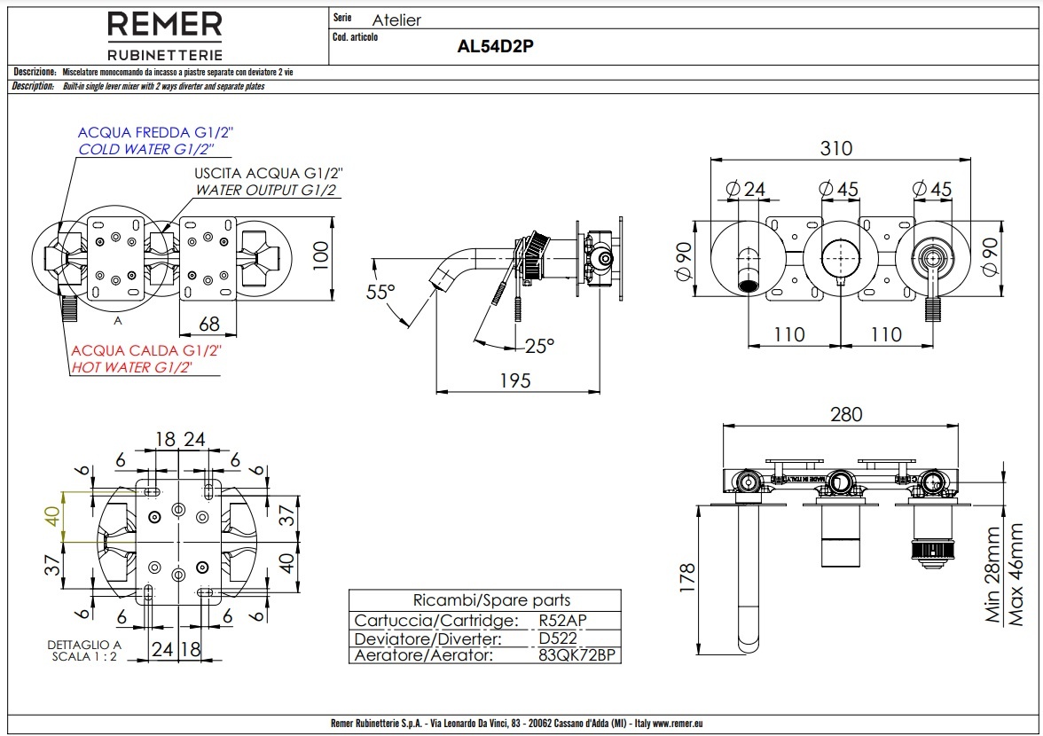 Встраиваемый смеситель для ванны Remer Atelier AL54D2PNO (черный матовый)