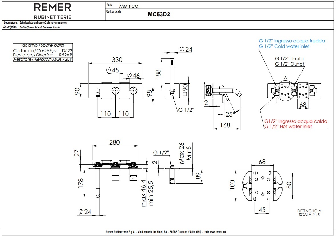 Встраиваемый смеситель для ванны Remer Metrica MC53D2BO (белый матовый)